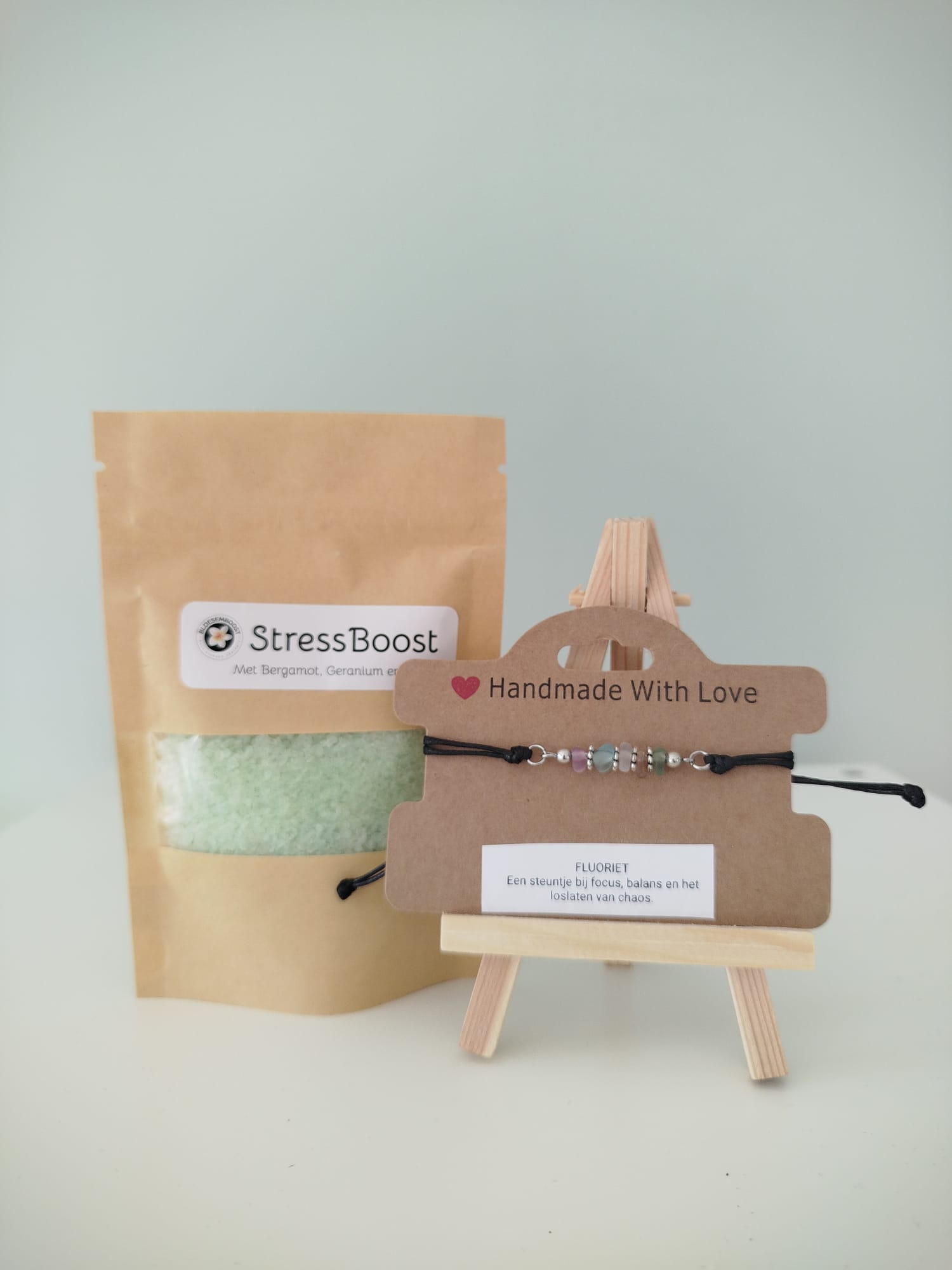 In het Pakket Duo zit een edelsteenarmbandje en een thee of badzout naar keuze.